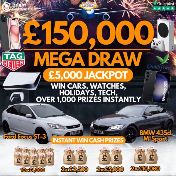 This competition is open to GB residents aged 18 or over. You can enter this competition up to 1000 times. This competition will close at 8:00 pm on February 4, 2024. The LIVE draw for this competition will be at 8:30 pm on February 4, 2024. You can watch the draw LIVE on Facebook, YouTube and Instagram. On entering the competition / placing your order you will receive your ticket numbers via email. These will also be visible on the My Account section of our website. We will also be posting updates on this competition and future competitions on our Facebook page so make sure you are following and our posts are set to show at the top of your newsfeed! If entering our competitions either by post or online please ensure you have read and agree to our terms and conditions, if your entries do not comply with the terms they will not be included in the draw. Please note you must sign up for an account before making your entry! Entries without an account cannot be processed. You must add your billing address to your account in order for your entries to be processed. To enter for free, please see our terms and conditions The Winner hereby agrees that all Prizes are subject to and are conditional on the terms and conditions of the Promoter, Prize provider, manufacturer and/or supplier and/or anyone that is involved in the provision or delivery of the Prize to the Winner.