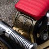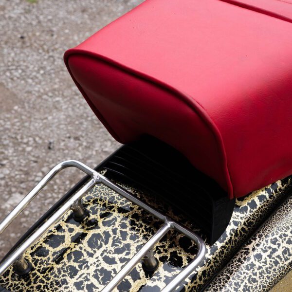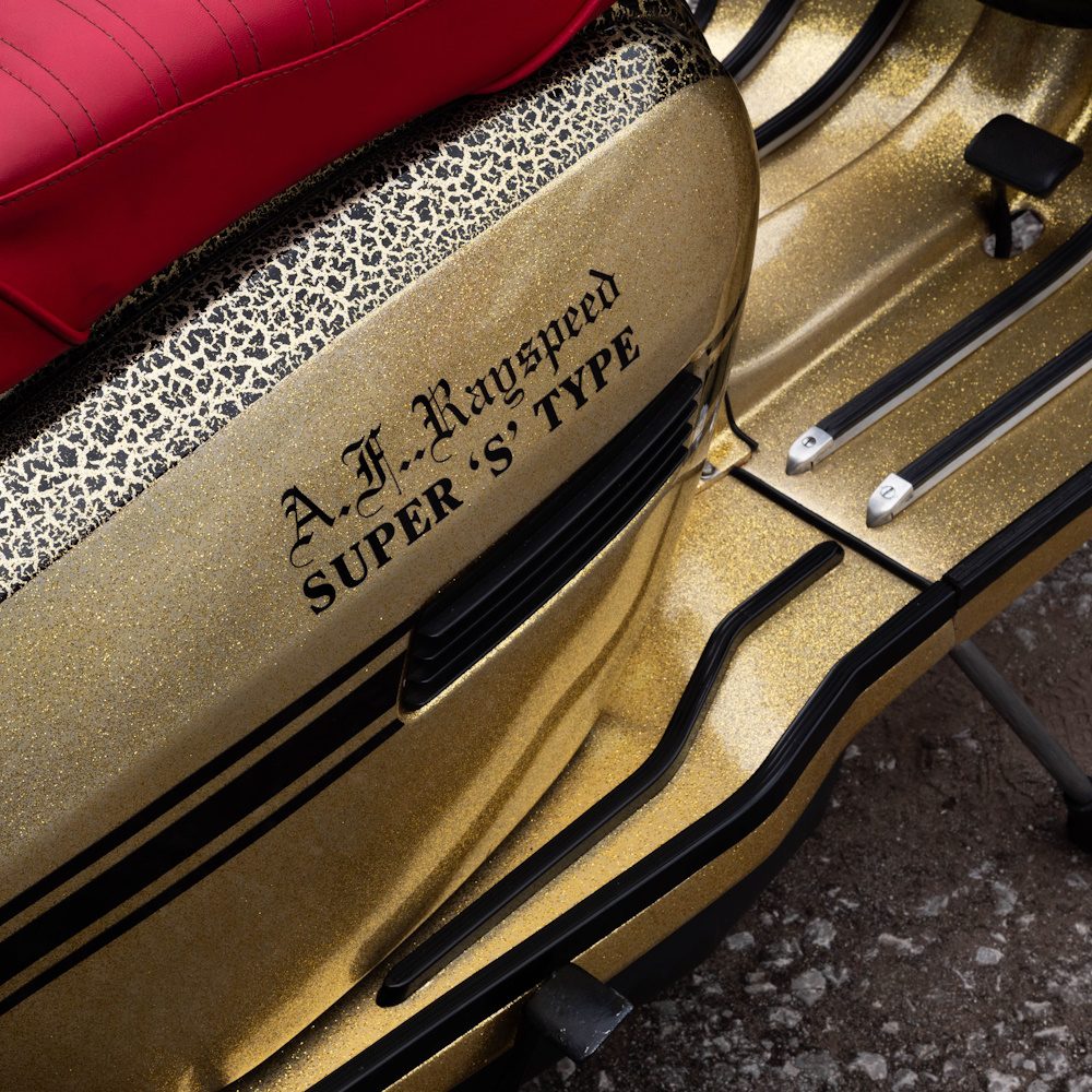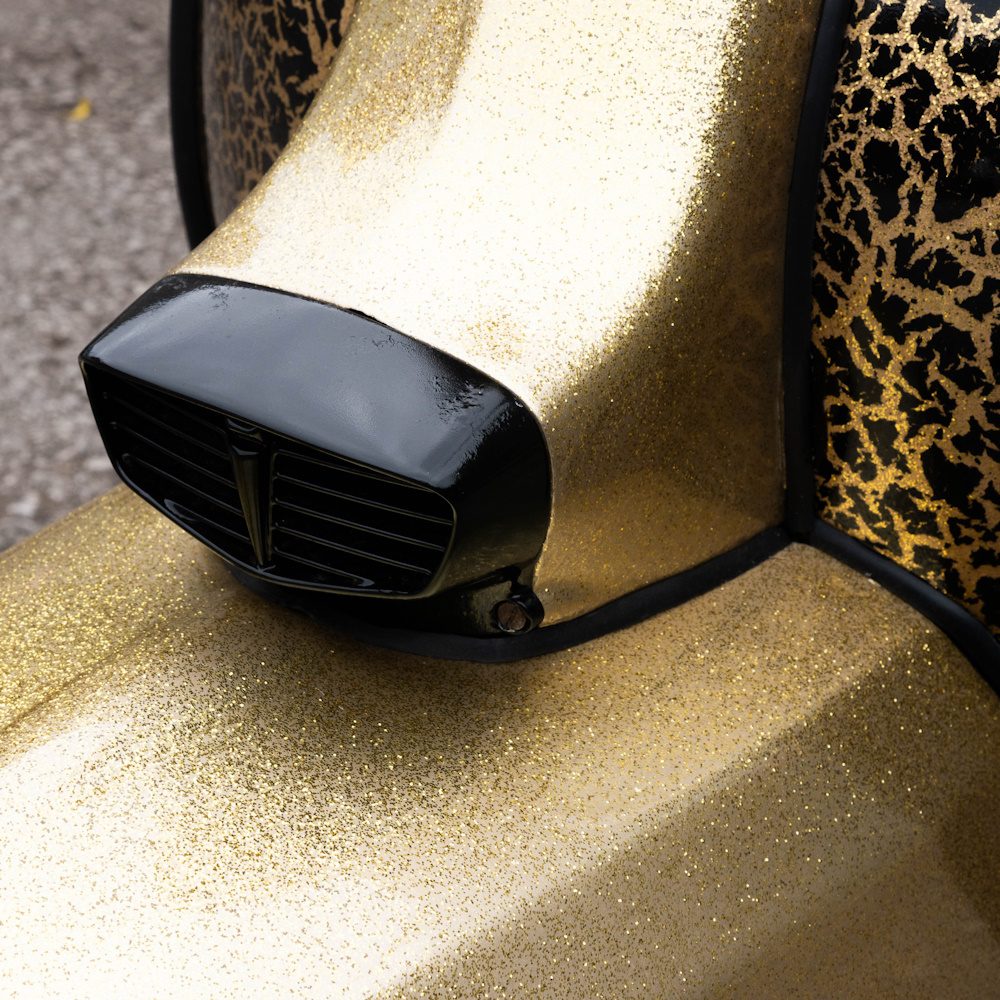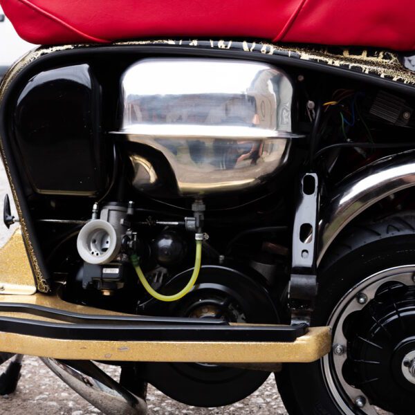 She has been painted in a one off gold metal flake with crinkle affect top coating in gloss black to the top of the scooter, finished off with its chrome wheels and wedge shaped lipstick red seat to complete that 80s style street racer look.
