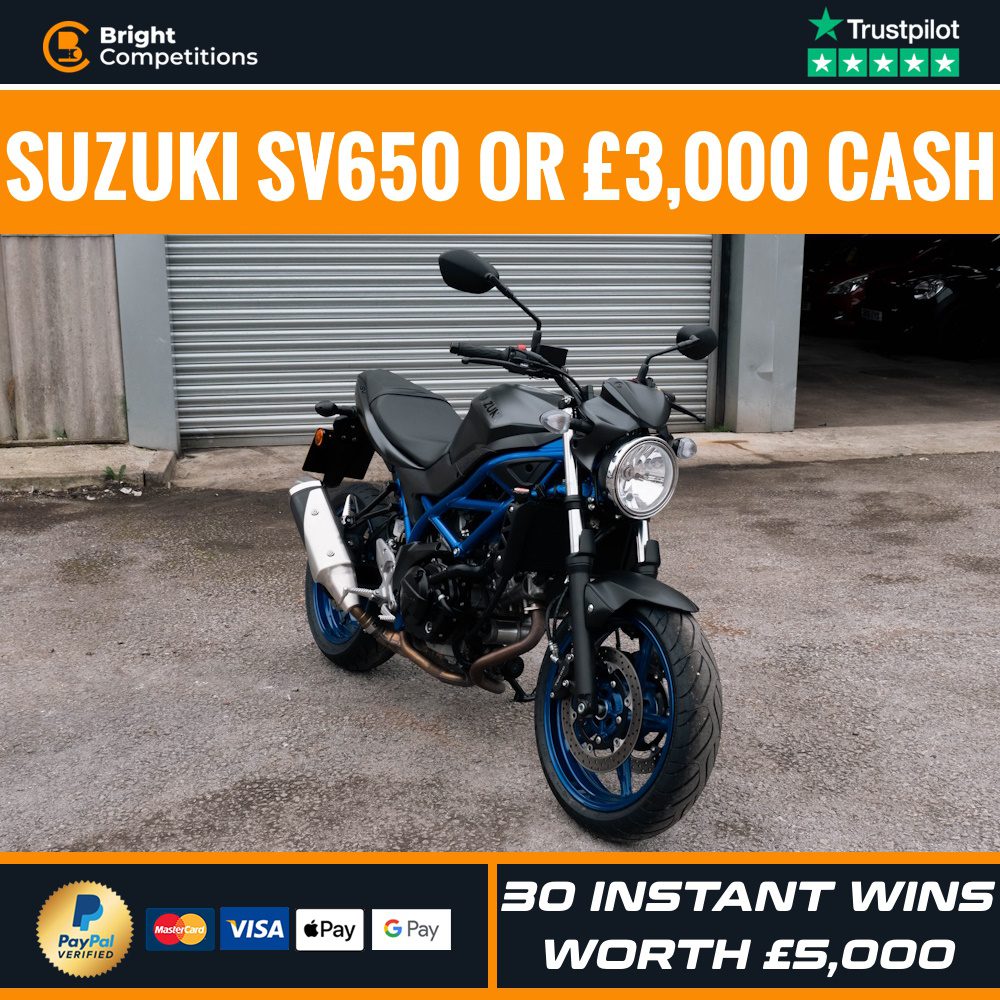 We are offering you the chance to win a Suzuki SV650 or £3,000 Cash for just £3.99! GUARANTEED Draw Tuesday 5th September @ 9pm