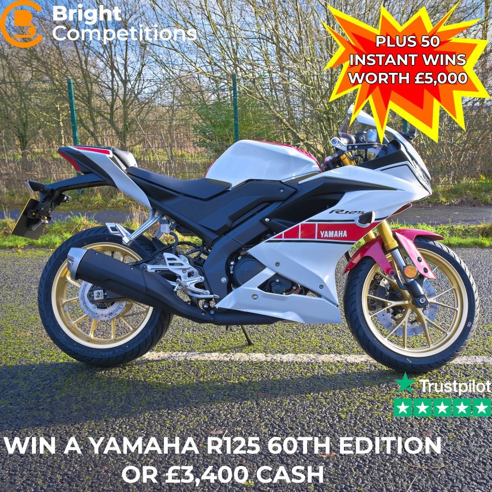 We are offering you the chance to win a Brand New Yamaha R125 60th Anniversary Edition or £3400 Cash for just £2.99! GUARANTEED Draw Tuesday 17th January @ 9pm