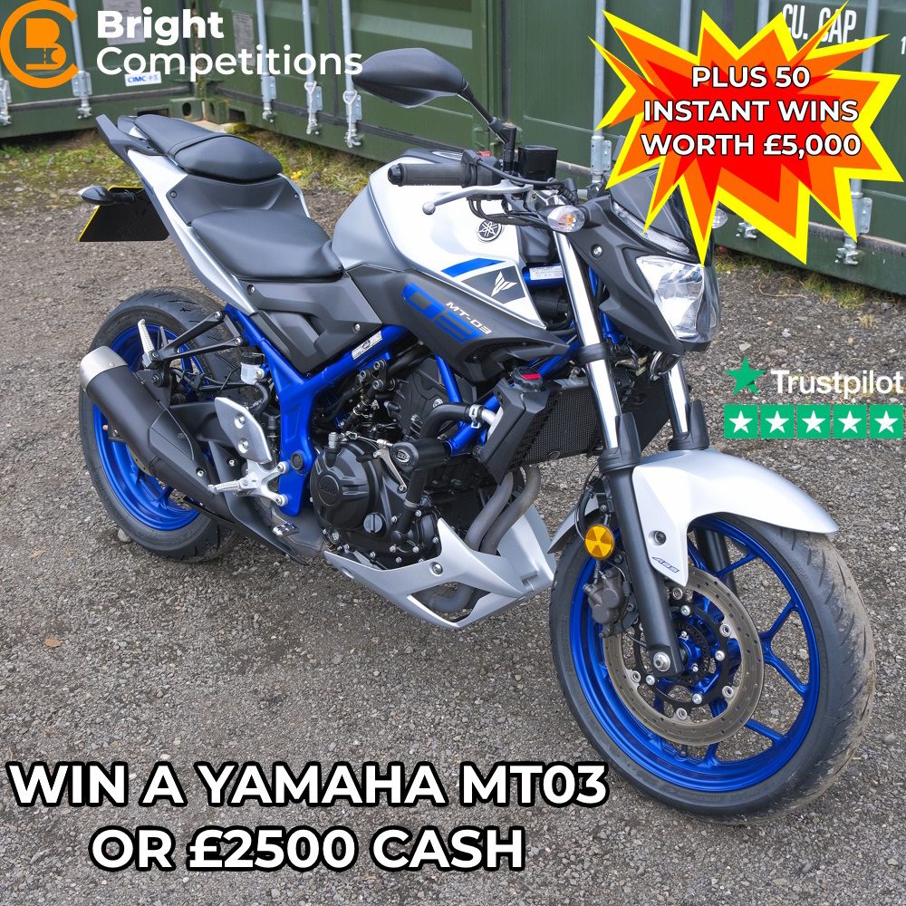 We are offering you the chance to win a Yamaha MT03 or £2500 Cash for just £2.99! GUARANTEED Draw Tuesday 28th February @ 9pm